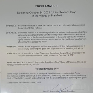 On Monday, October 18, 2021, the Village Board of Plainfield proclaimed October 24, which is United Nations Day, as Plainfield UN Day, on behalf of the Zonta Club of the Joliet Area and the Rotary of Plainfield.